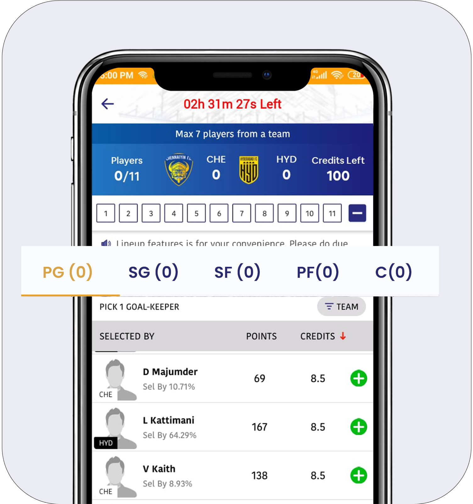 Team Combinations: On Jeeto11 App, you get 100 credit points to pick 11 players for the upcoming matches, where the motive is to make the best-possible fantasy team. Following are the rules for picking players from different sections:
