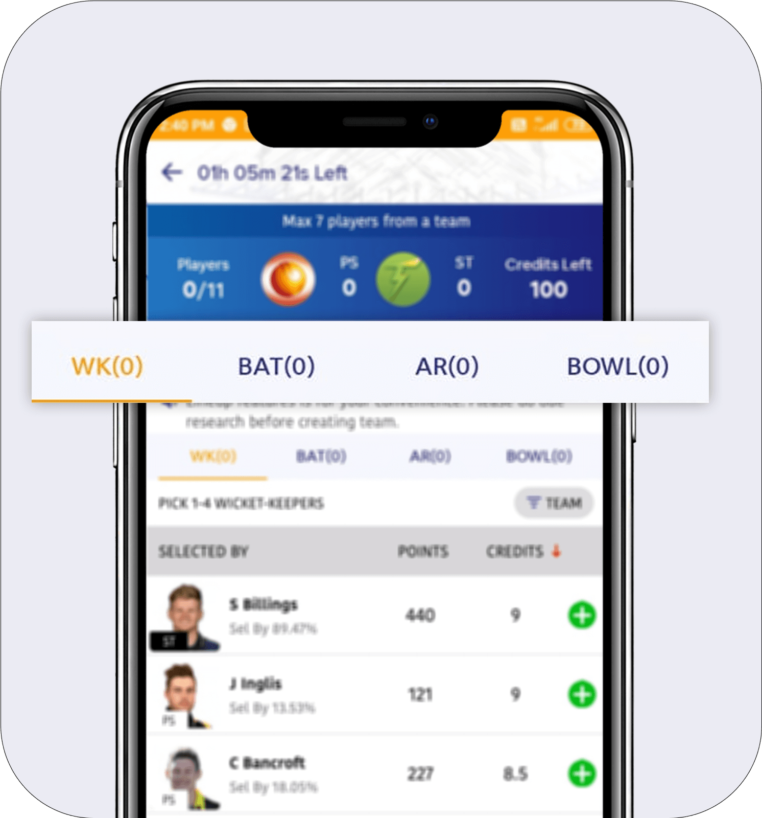 4.You can pick 1-4 wicket-keepers, 3-6 batsmen, 1-4 all-rounders and 3-6 bowlers.